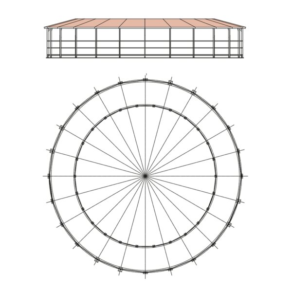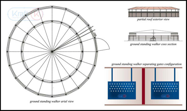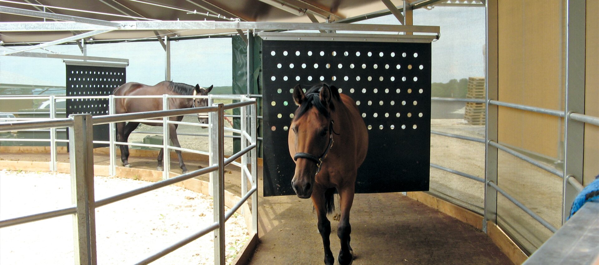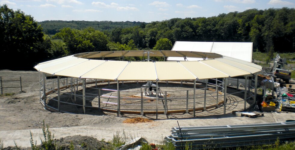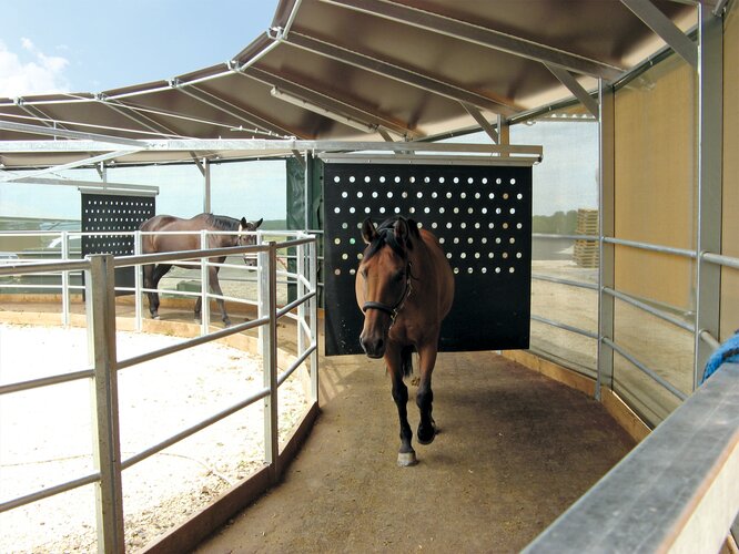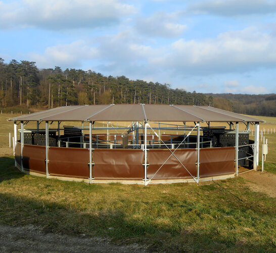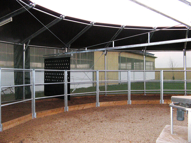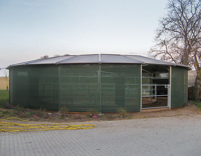 Das Grundgerüst ist baugleich mit der Boden-Führanlage mit Hufschlagüberdachung. Bei der ECO erfolgt jedoch die Befestigung der Zaunelemente mit Erdnägeln. Die Dachelemente sind aus hochwertigem Planenstoff gearbeitet, die Umzäunung ist mit einfachen Stahlrundrohren versehen.