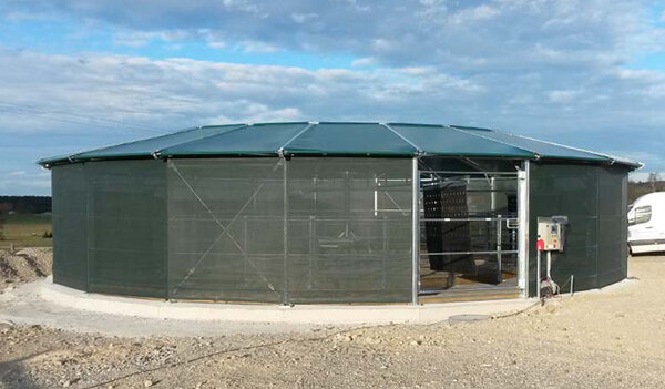 Wahlweise wird der Außenzaun zwischen den Zaunrohren mit Planenstoff bespannt oder vollflächig mit einem Windschutznetz versehen.