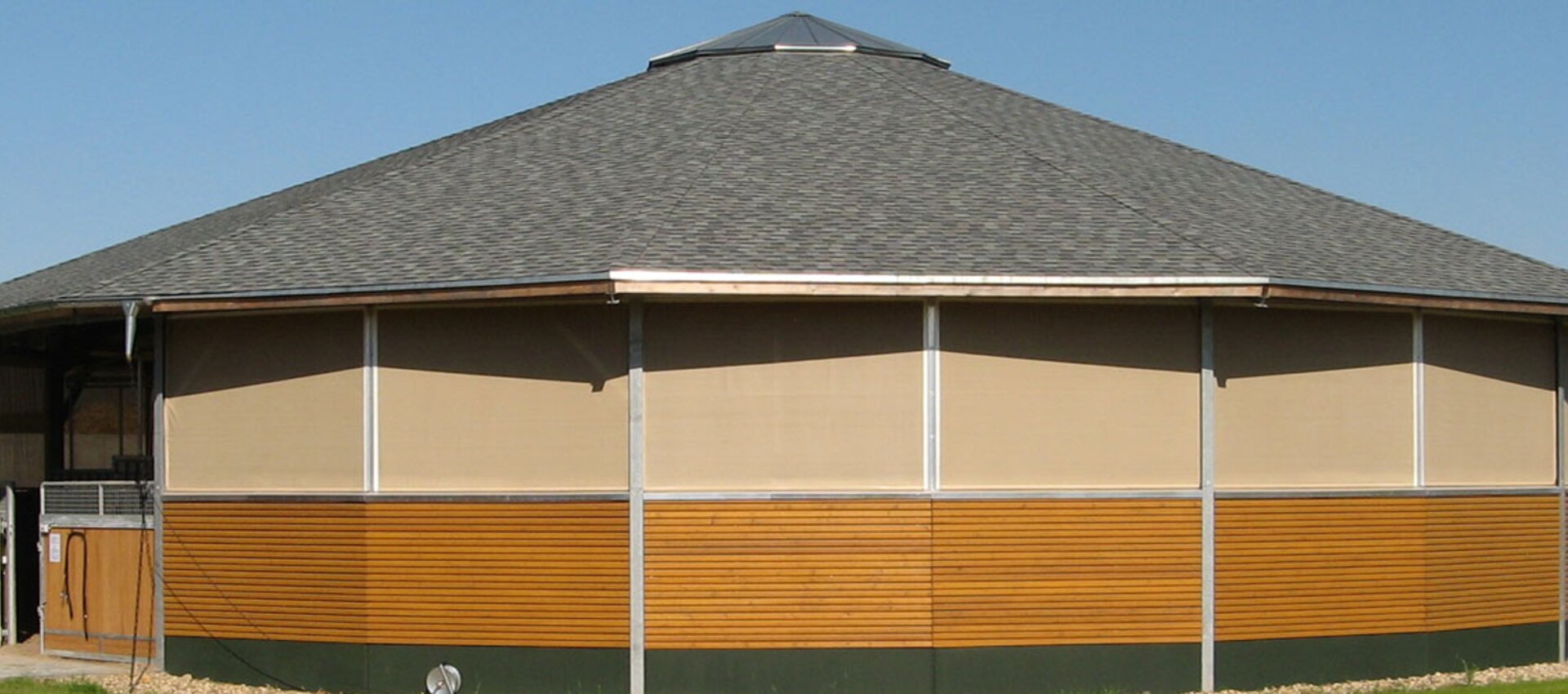 A tent rail is fastened to the frame and the entire screen is stretched horizontally around the horse walker.
