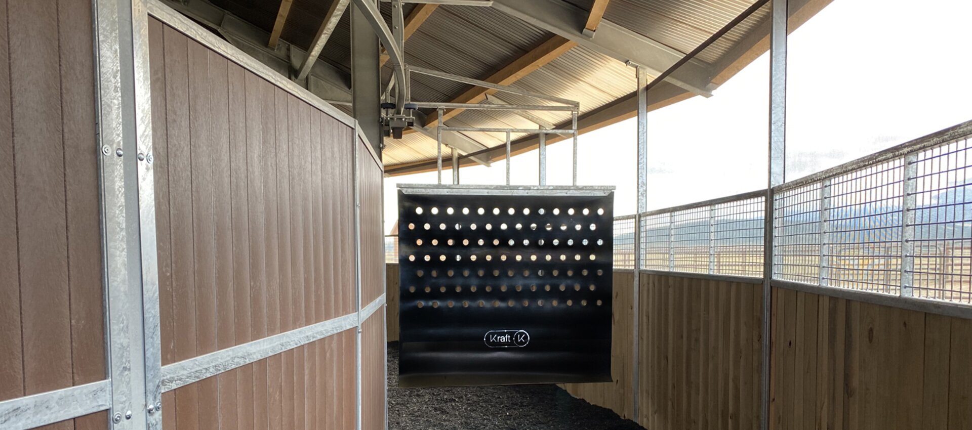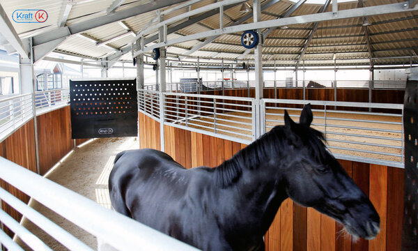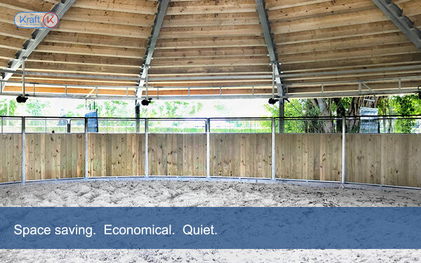 Ideal for farms that need a quiet horse walker that also offers an inner space that can be used for training or storage. This model is a lower cost alternative to the round Rail-Gliding Horse Walker.