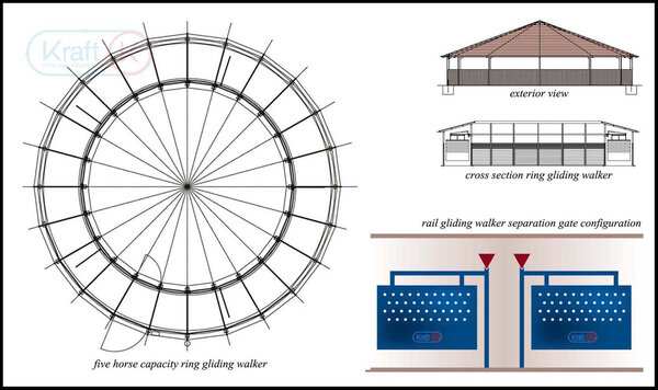 Our Ring-Gliding Horse Walker features wheels attached to the inner fence. Hanging or rotating gates are mounted to a double-ring that glides on the wheels.
