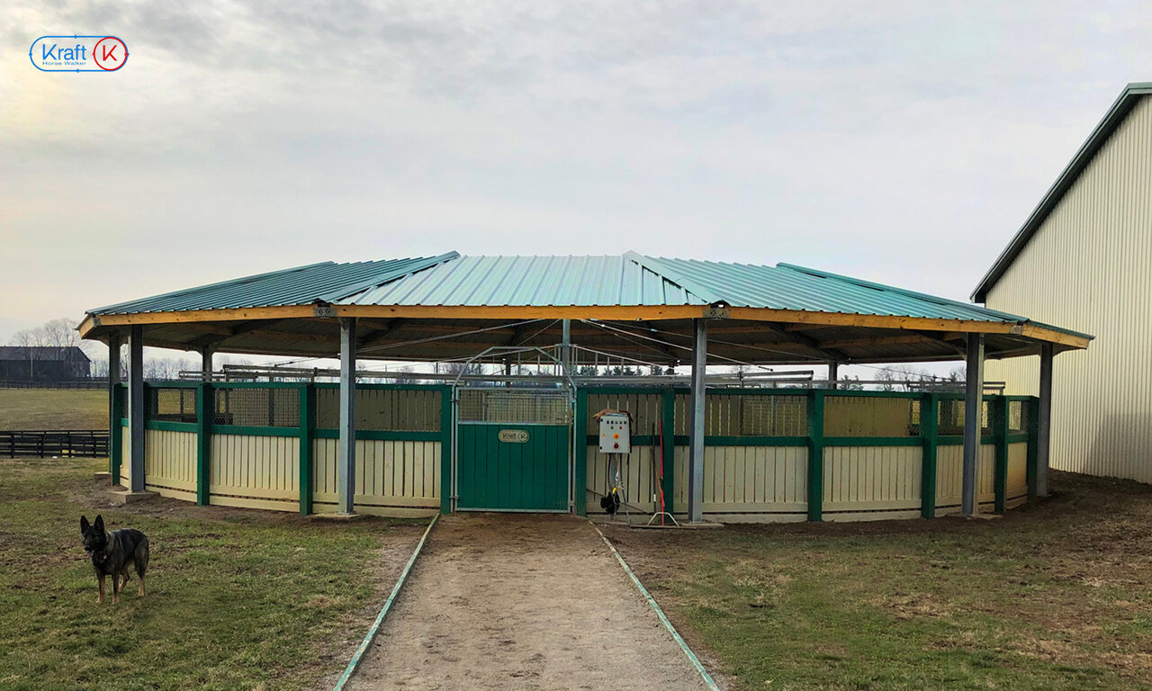 Ground-Standing Horse Walker with partial roof, 18m, 6 Horses, Overbrook Farm, USA