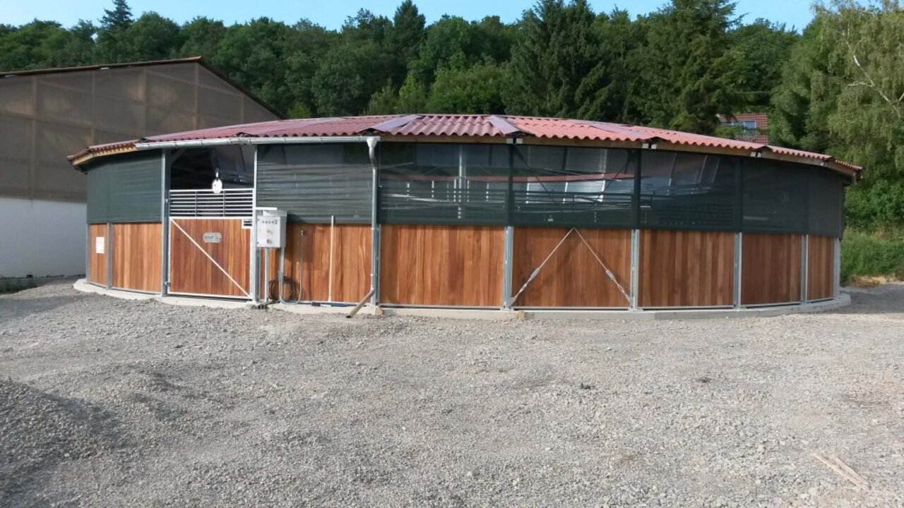 Ground-Standing Horse Walker with partial roof, 20m, 6 Horses, Erdbeerhof Deuerer, Germany